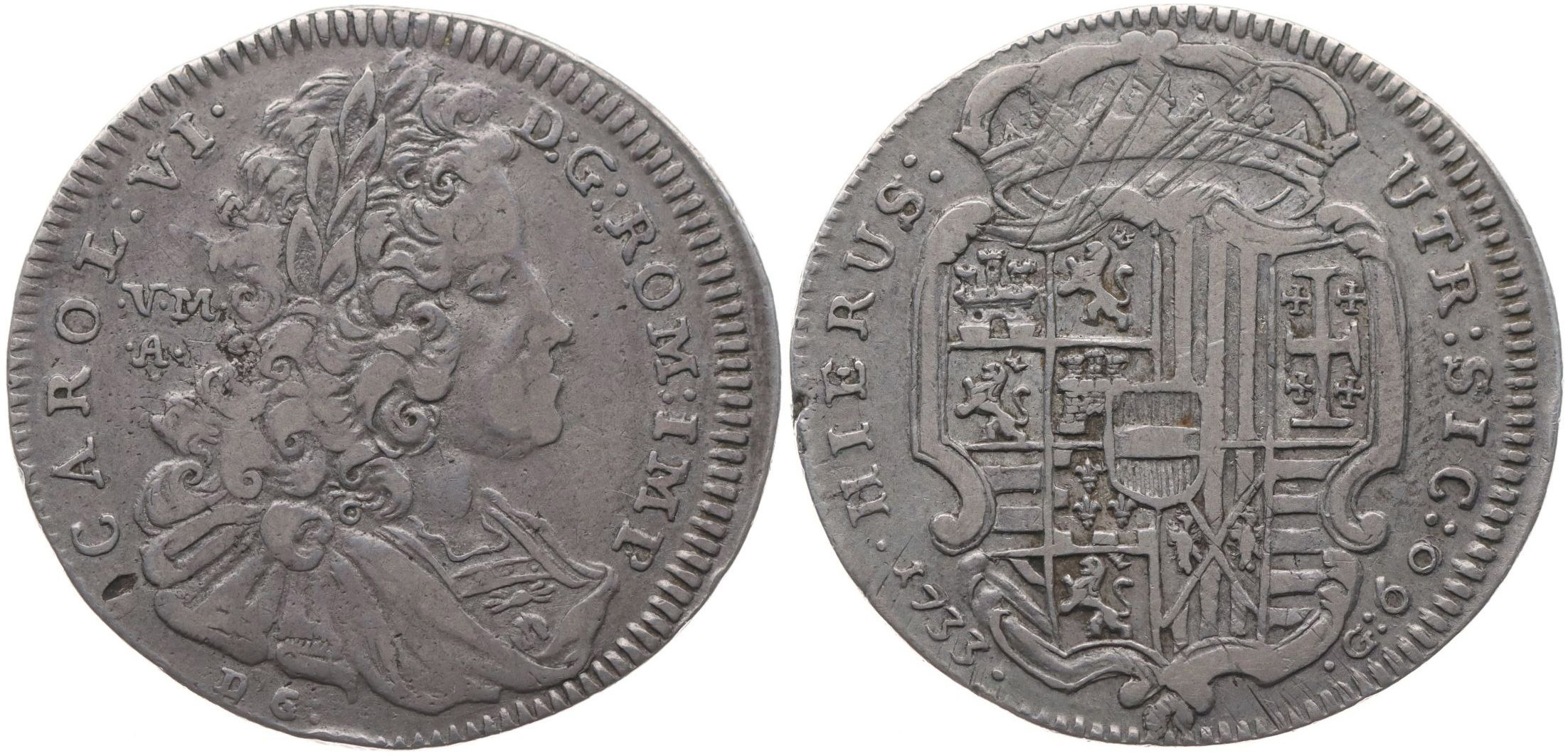 60 Grana (1/2 Tolar) 1733, poprsí zprava, opis / korunovaný znak s Řádem zlatého rouna, minc.Neapol, Sch.15, LG.II/916_RR!