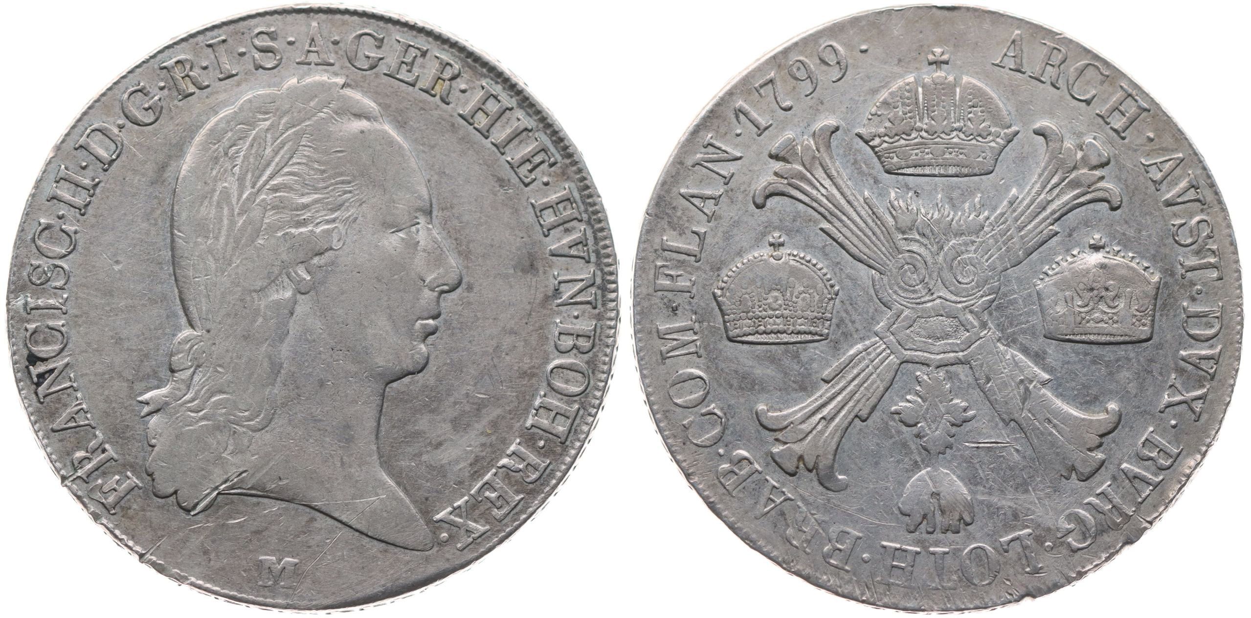 Tolar křížový 1799 M, P.12, opis na hraně "LEGE ET FIDE"