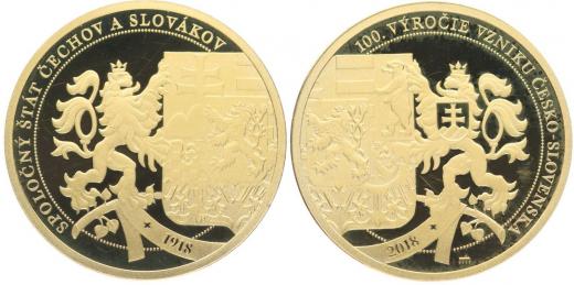 Medaile k 100.výročí Česko-Slovenska 1918 - 2018 Lev zprava drží státní znak, opis / lev zleva drží státní znak, opis Punc.999/1000, Au 25 mm, 7,775 g_orig.kapsle + repre dřevěná etue + certifikát