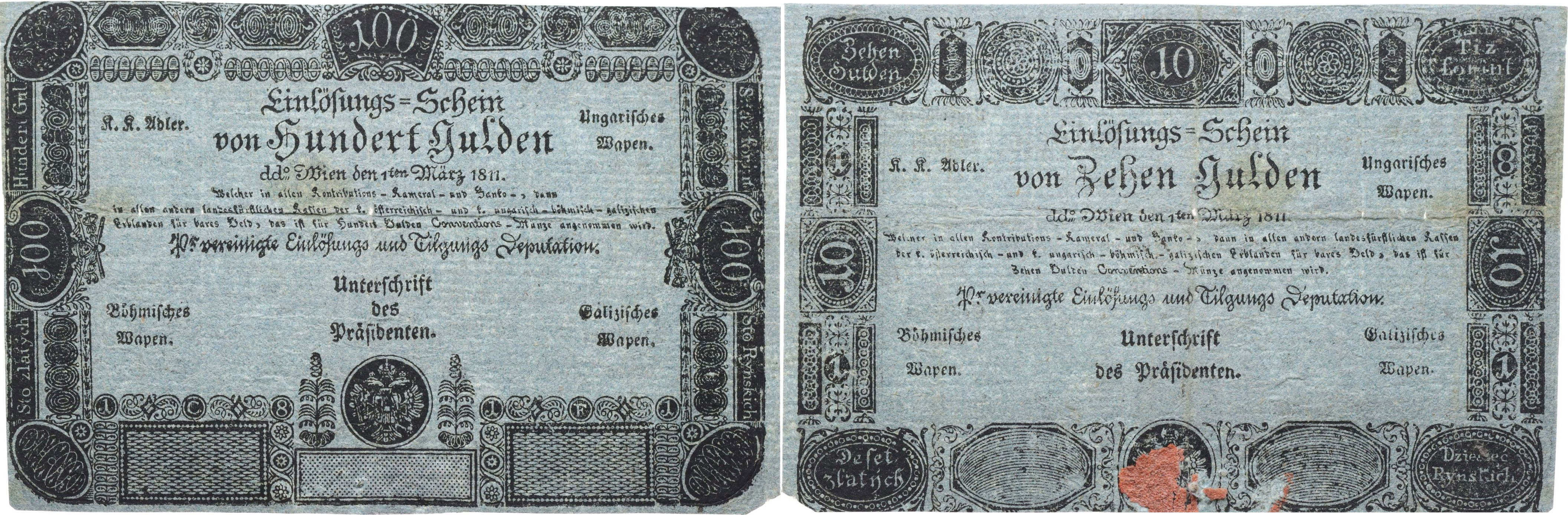10 / 100 Gulden - emise 1.3.1811, Pick.A47 - A49 Formulář, tištěno na šedomodrém papíru_zbytek lepu u spodního okraje