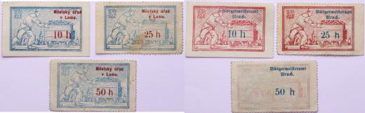 Lom ( Bruch) městský úřad - 10 h. b.l. (1921), česko - německý text, rohový kus, 2 strany stříhané, DH.16.1.1a 25 h. b.l. (1921), krajní kus 1 strana stříhaná, DH.16.1.3a50 h. b.l. (1921), DH.16.1.4a_celk.3 ks