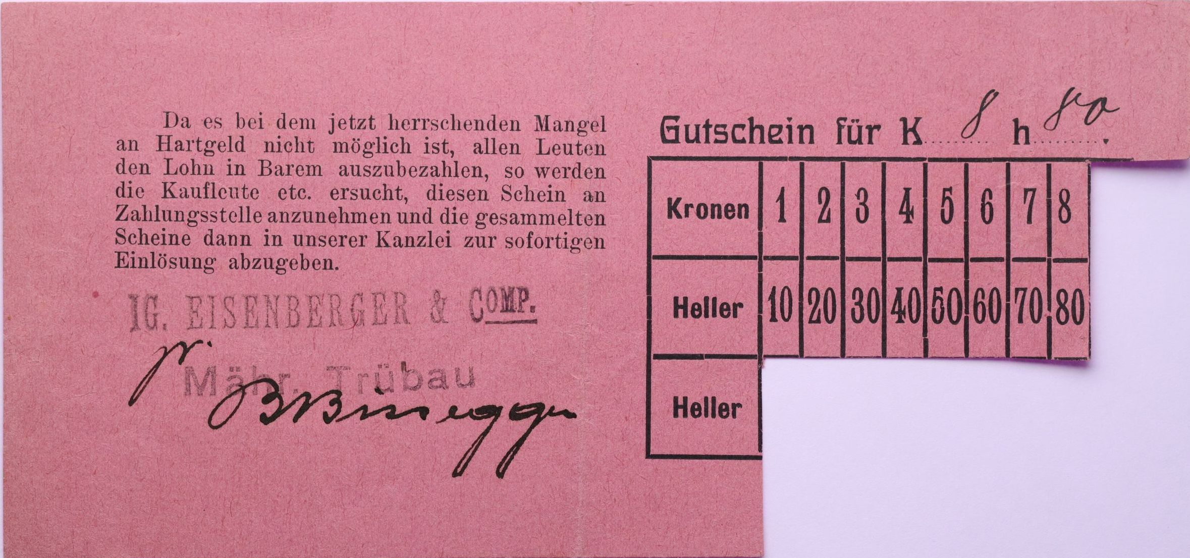 Moravská Třebová (Mährisch Trübau město - Ignatz Eisenberg&Comp. 8 K 80 h b.l.(1914), část.odstřižen, dvouřádk.raz.firmy, 1x podpis DH.121.1.1a