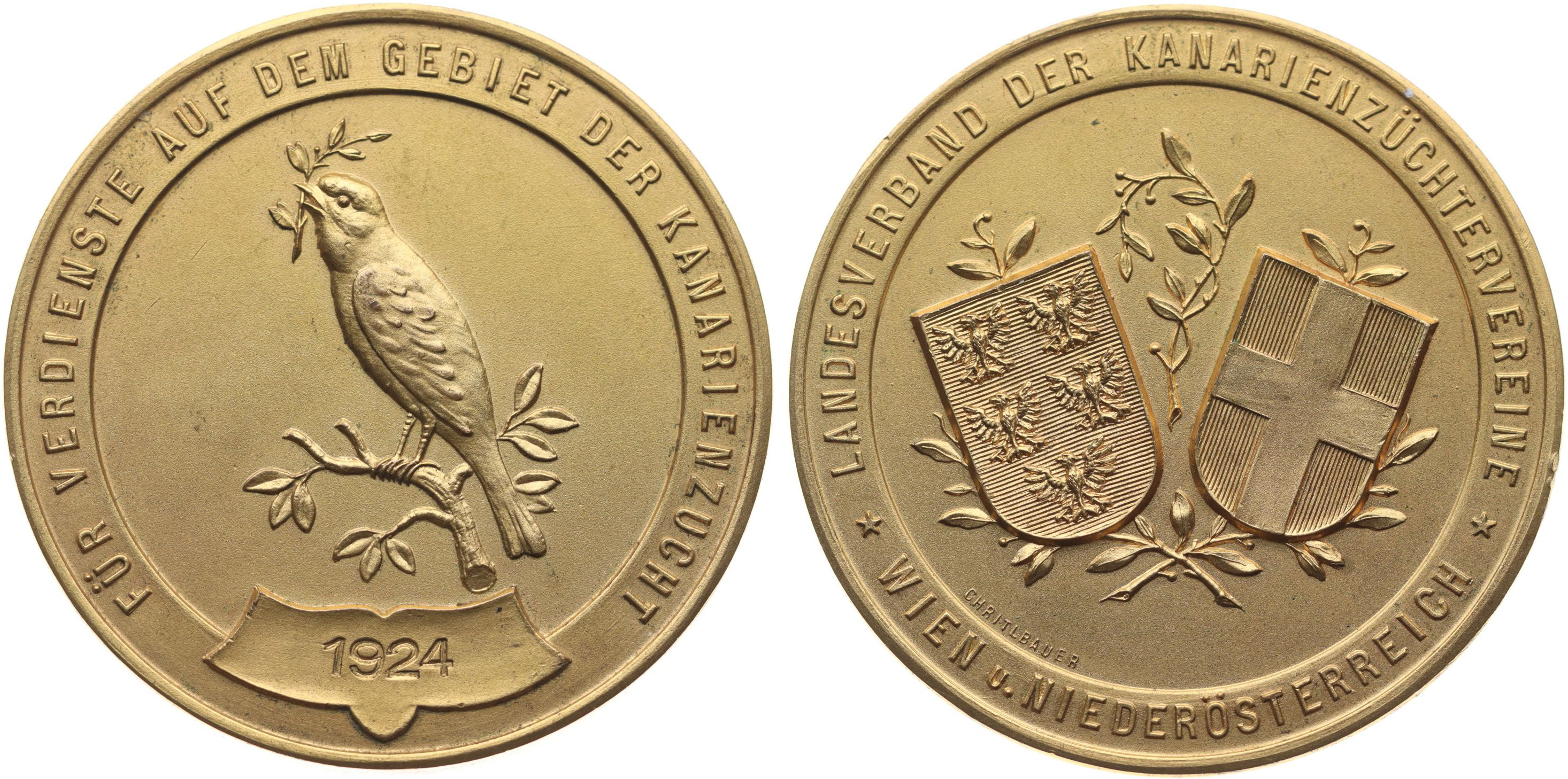 Vídeň - spolek chovatelů kanárů Vídeň a Dolní Rakousko 1924 Kanár na větvičce, opis / dva znaky, opis, Sign.Christlbauer Pozlac.bronz 45 mm