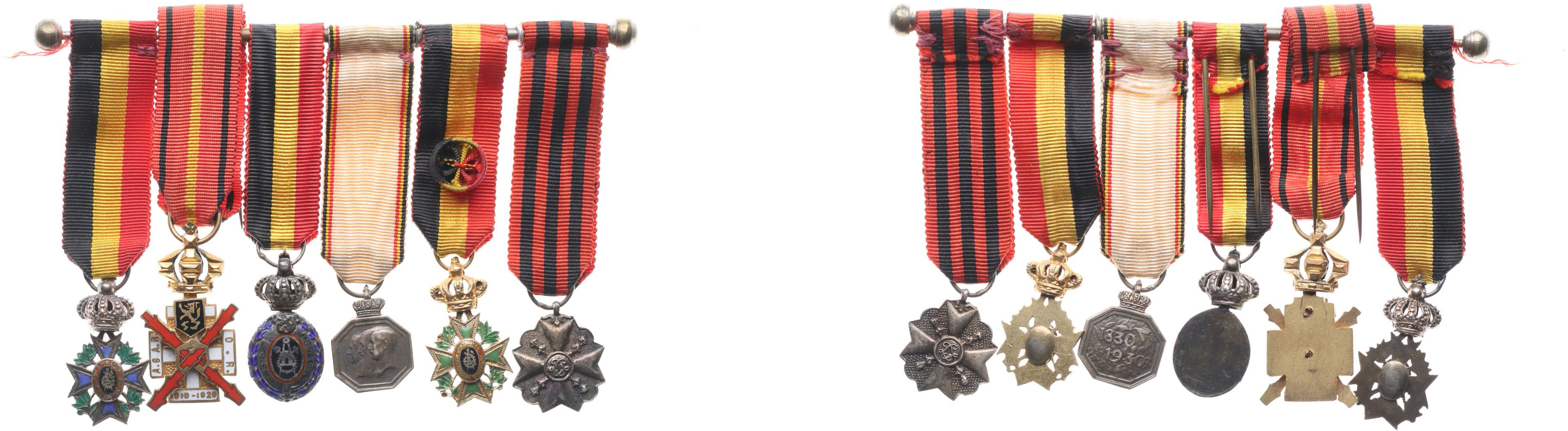 Soubor 6 ks miniatur vyznamenání na spojce: 1) vyznamenání práce za průmyslové zásluhy II.tř. 2) pamětní záslužný kříž 1918-29 3) vyznamenání práce II.třídy 4) medaile na 100 let Belgie5) vyznamenání práceza průmyslové zásluhy I.třídy 6) stříbrná medaileza dlouholetou službu_orig.stuhy celk.6 ks