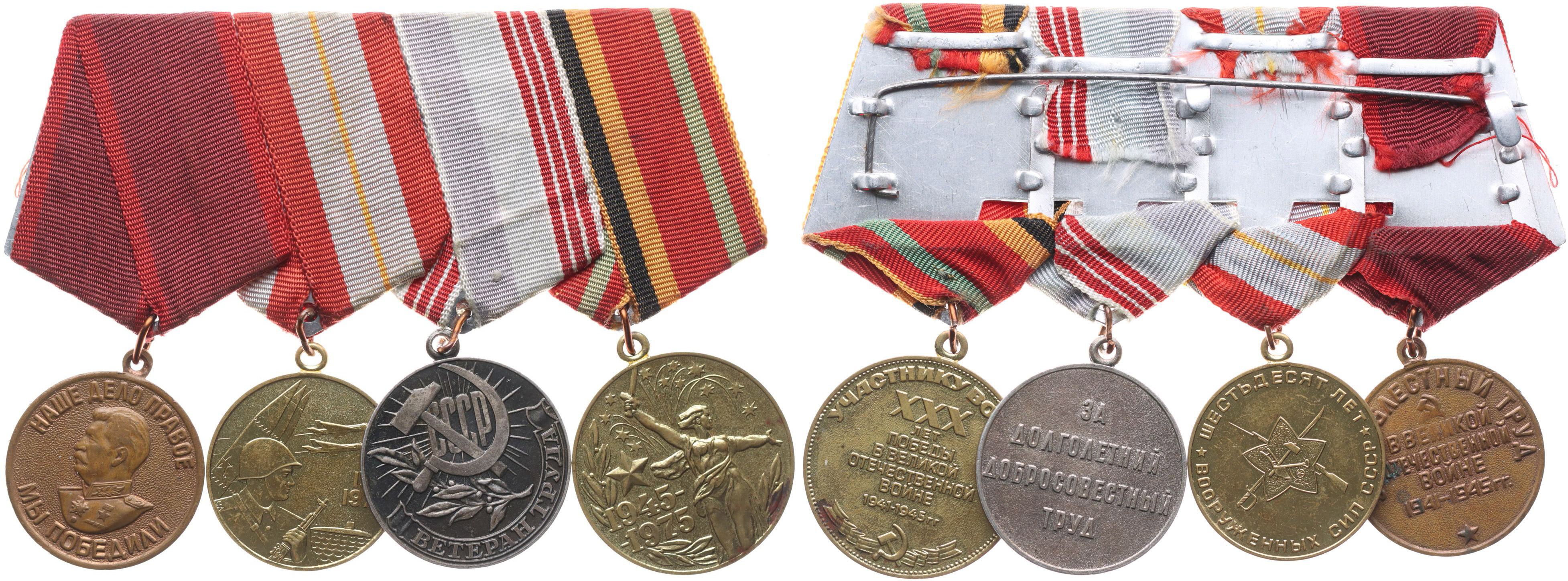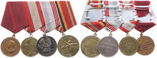 Spojka 4 medailí SSSR: 1) Za stateč.práci ve Velké vlast.válce var.3, Herf.3.41 2) 60 let sov.ozbroj.sil, Herf.3.50 3) Veterán práce, typ 1, var.2, Herf.3.4 4) 40 let vítězství -pro bojovníky, pozlac, typ.1_4 ks orig.stuhy