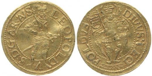 Dukát b.l., stojcí Leopold / sv.Leopold, M-A.128, tab.23/1 _dr.zvlněný R!
