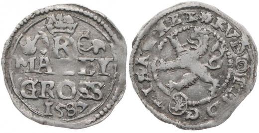 Malý groš 1587, K.Hora-Šatný, HN.1b (opis 7a), Ja.6b var.: mincmistr.značka posazena výše do středu mince