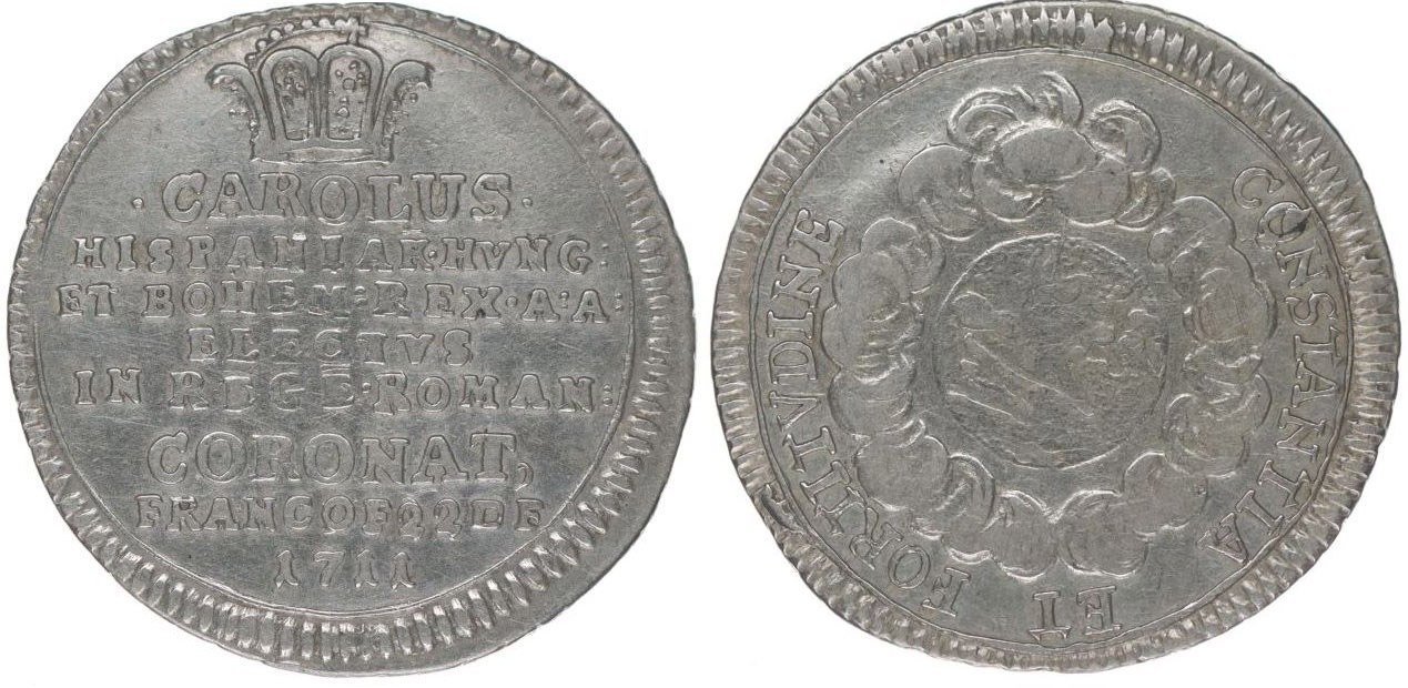 Menší peníz na korunovaci na římského císaře ve Frankfurtu 22.12.1711 Pod korunou 8řádk.nápis / zeměkoule v oblacích, opis, Nesign., Ag 20 mm, 2.06 g, Nov.XI/F-47b, Mo.1368_R!