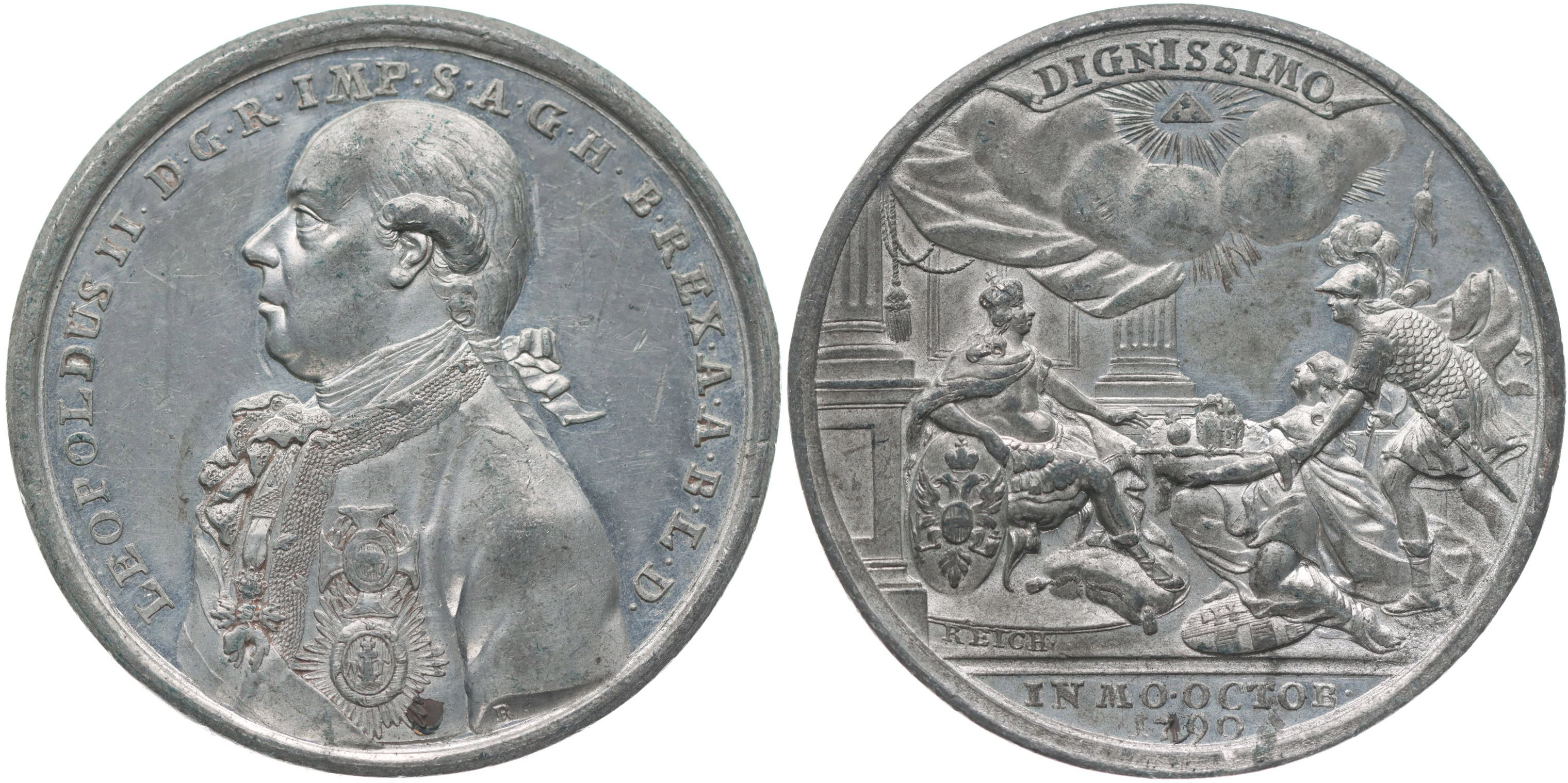 J.Ch.Reich - medaile ke korunovaci na římského císaře ve Frankfurtu#Sn 9.10.1790, poprsí císaře zleva, opis / sedící císař pod baldachýnem, proti klečící Germanie s vojákem, 2řádk.nápis v úseči, opis, v úseči,Cu stift,Sign., Sn 47 mm, 36.86 g, Nov.XVI/E-2c, Mo.2211, LG.XIV/1087