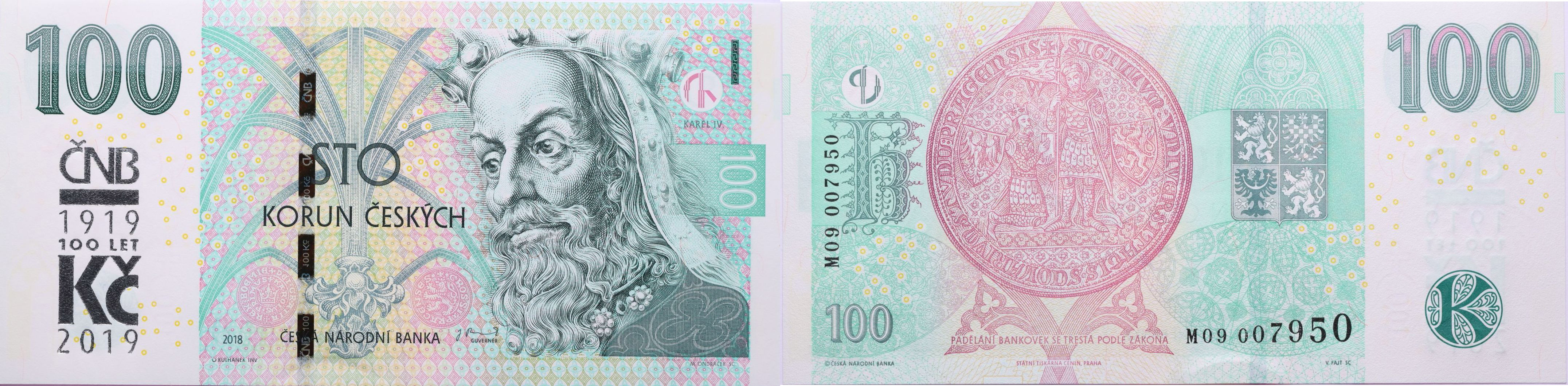 100 Kč 2018, sér.M09 s přítiskem ČNB 100 let Kč 1919-2019 He.CZ33a_"neperf."