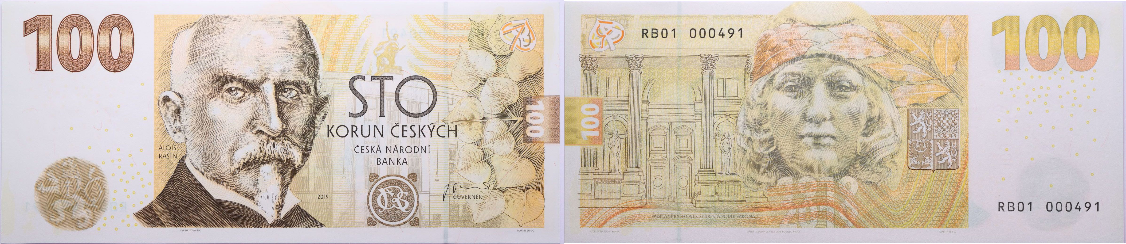 100 Kč 2019 A.Rašín ČNB, sér.RB01 000491_v pam.obalu s knížkou