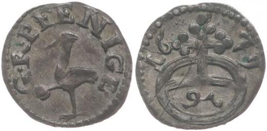 Fenik 1679, kráčející jeřáb, opis G.R.PFENIGE / znak, vročení, KM.16 _R!