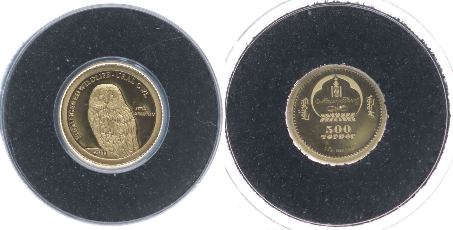 500 Tugrik 2011 - Puštík bělavý, Au 999, 11 mm, 0,5 g_orig.kapsle