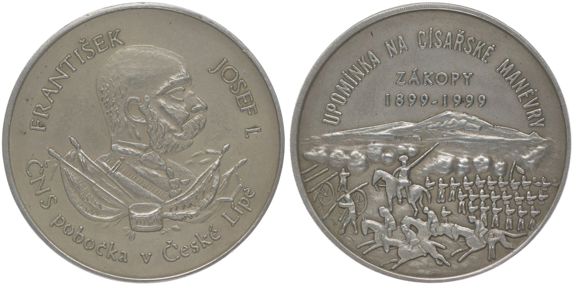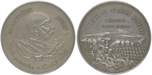 K.Lahoda - 100.výročí císařských manévrů v Zákupech, 1999 Poprsí císaře zprava, opis / vojenská scéna z manévrů, dvojitý nápis, opis, Punc. v rev., Ag 30 mm, 28,8 g, náklad 25 ks, MF.A4/4d, čís.7 _certifikát
