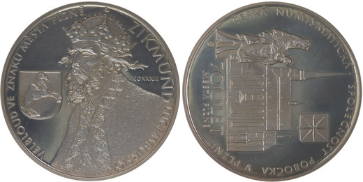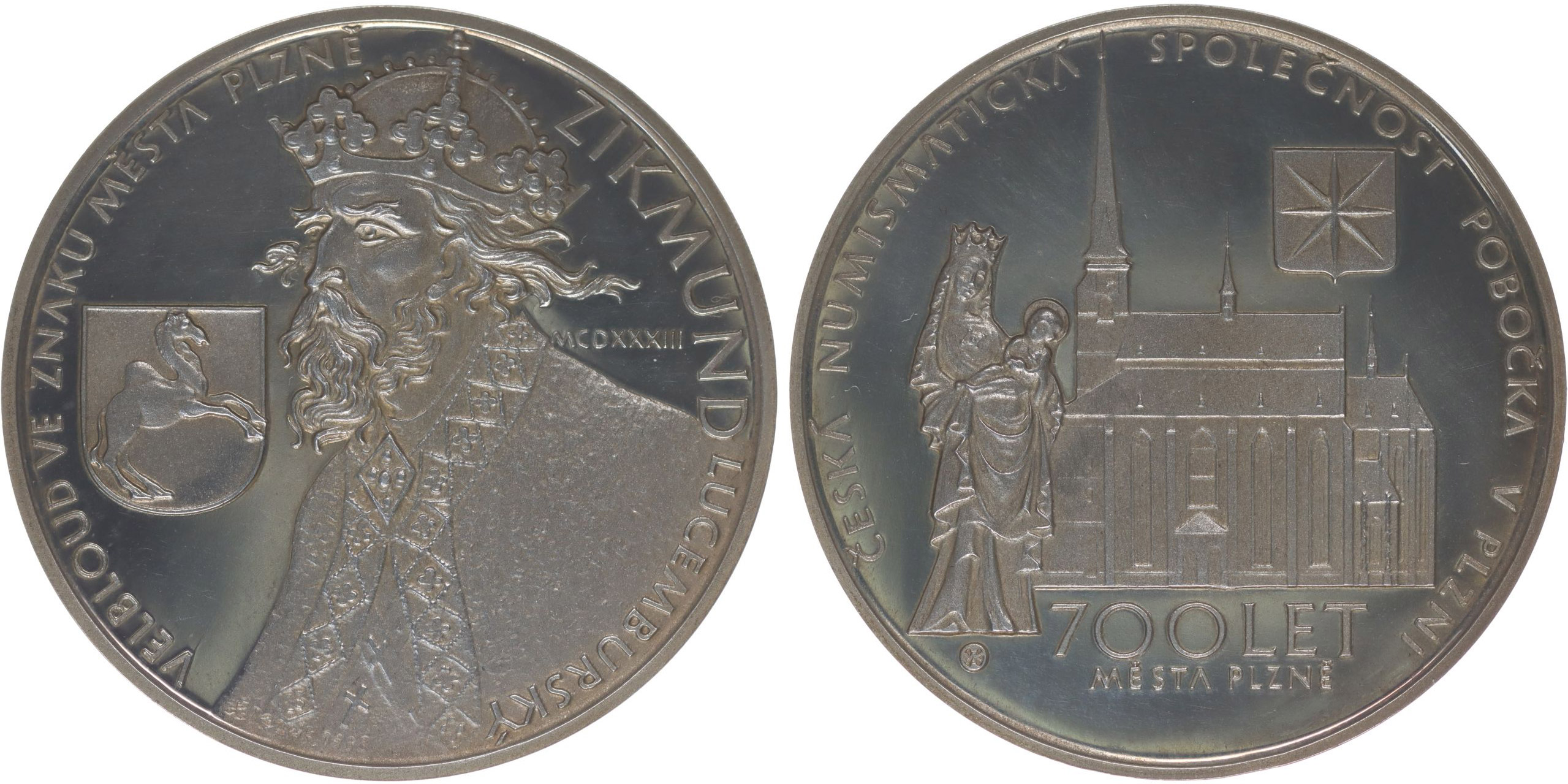 L.Kozák - 700 let Plzně - Zikmund, 1993#Ag Poprsí zleva, znak s velbloudem, opis / Kostel, madona, opis, Sign., Punc., Ag 900/1000, 40 mm, 31,9 g, FM.32/17a