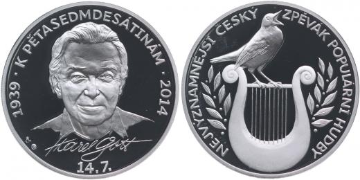Karel Gott - medaile k 75.narozeninám 1939 - 2014 Poprsí čelně, opis / slavík na lyře, opis, Sign. (autoři Bejvl, Horák Hásek), Punc.999 Ag 37 mm, 31,1 g (unce), čís.1778 _orig.kapsle + certifikát + etue
