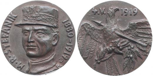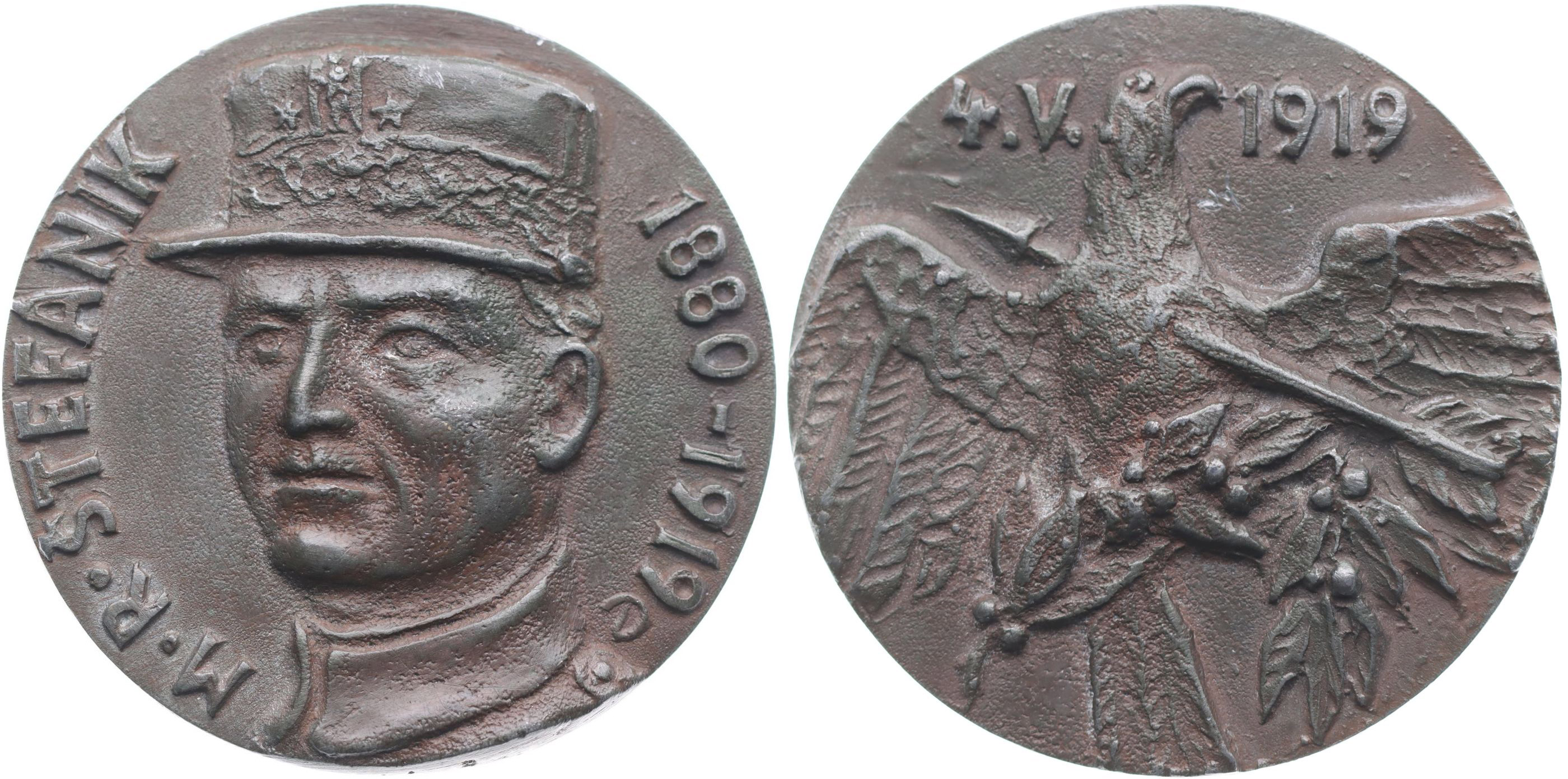 M.R.Štefánik - 1880 - 1919 portrét čelně, opis / letící orel zasažený šípem 4.V.1919, Lité Fe patinované 60 mm