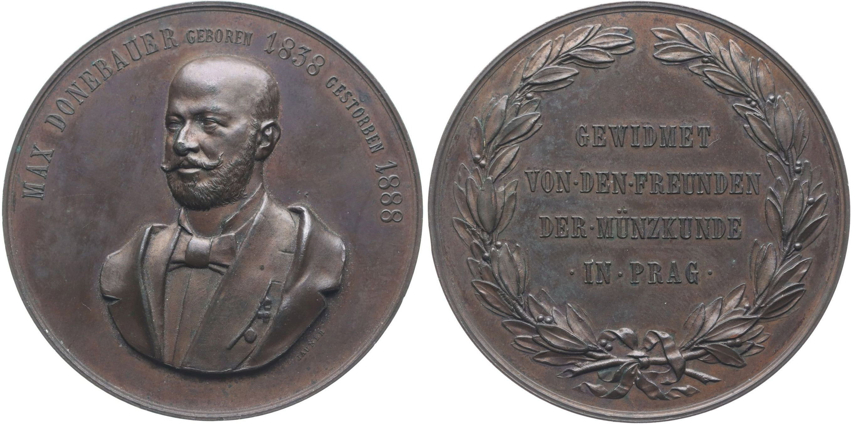 Max Donebauer, numismatik - úmrtní medaile, 1888 Poprsí mírně zleva, opis / 4-řádkový nápis ve vavřínovém věnci, Sign., Bronz 58 mm, Ho.7249