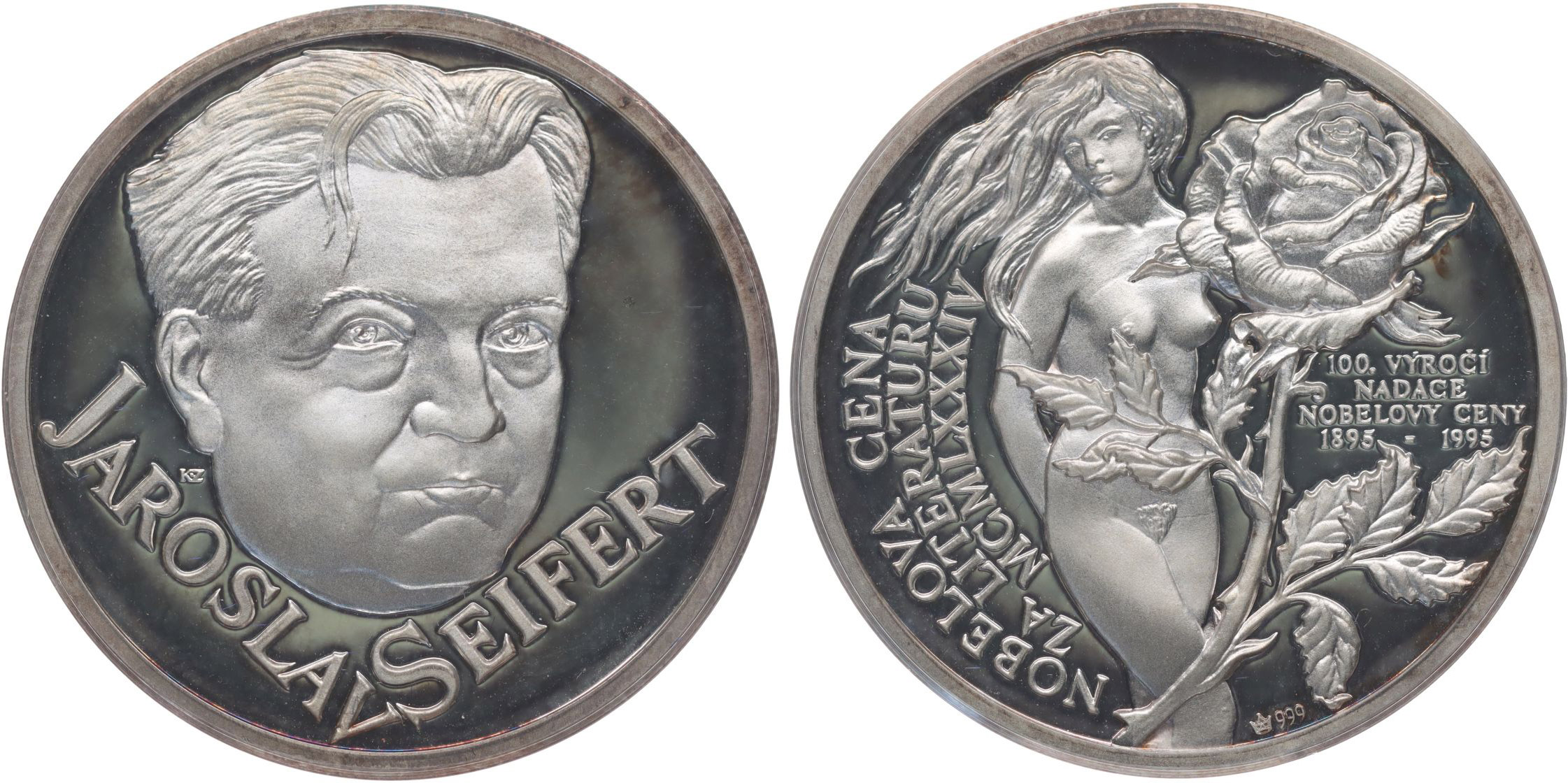 Jaroslav Seifert - 100 let nadace Nobelovy ceny 1895 - 1995 Nobelova cena za literaturu 1984, Sign., 35 mm, Ag 14,98 g