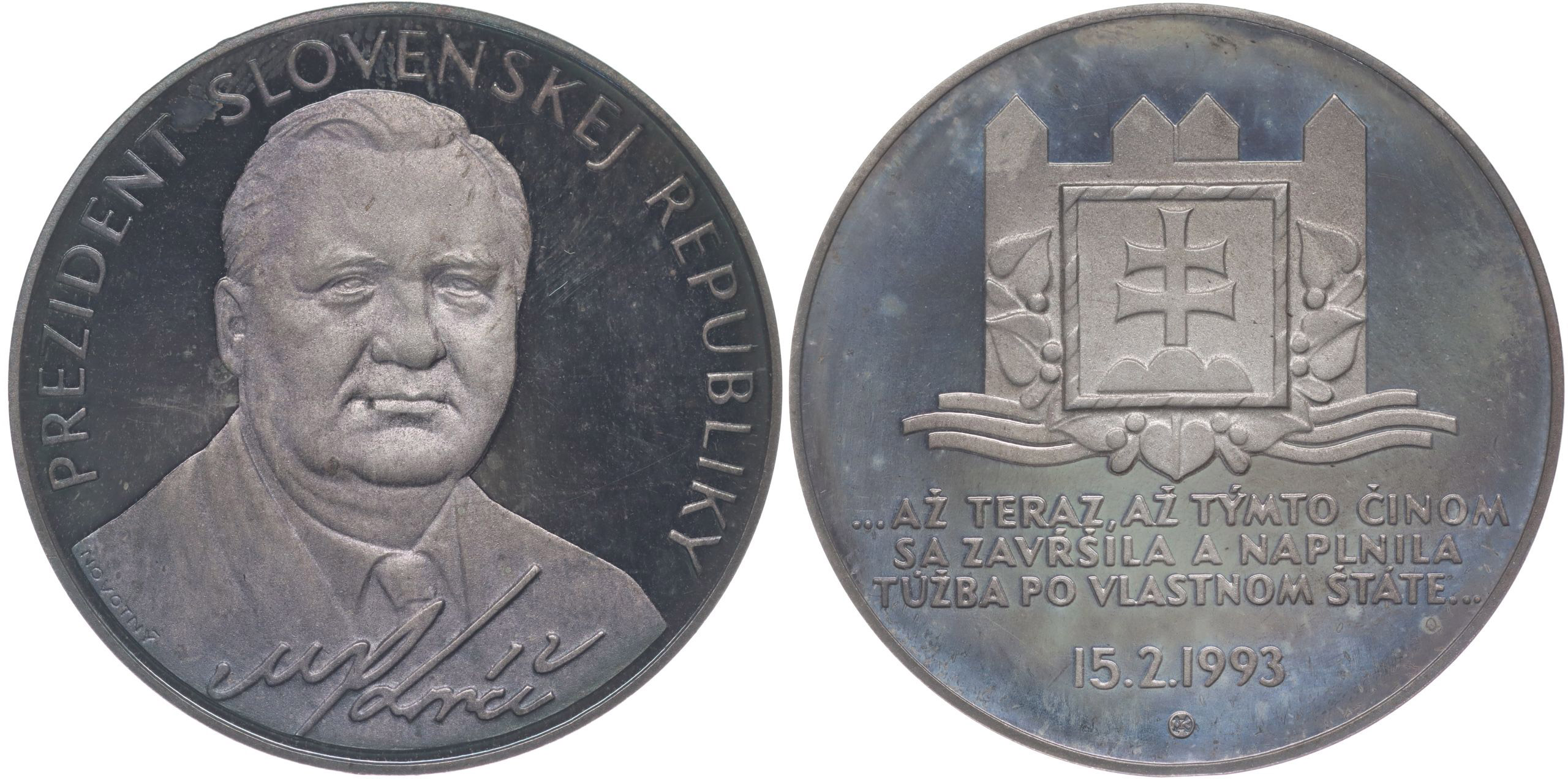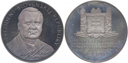 Michal Kováč - prezident Slovenské republiky b.l. (1993) Poprsí čelně, opis / slovenský znak před bratislavským hradem, 4řádk.nápis, Punc.900, Ag 40 mm, 39,10 g