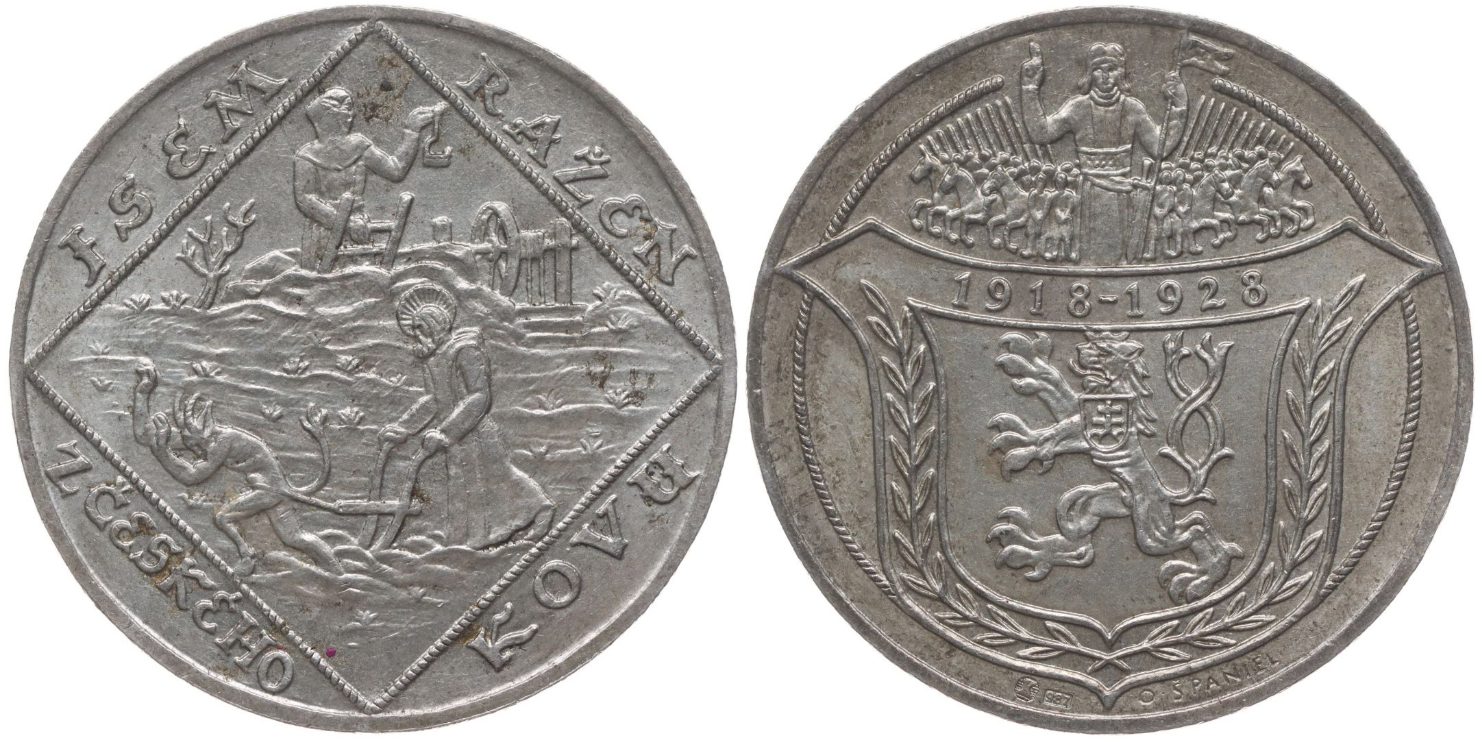 Jsem ražen z českého kovu - 10. výročí republiky 1928#Ag Sv.Prokop orá s čertem, havíř, opis / státní znak, Sv.Václav s rytíři, Sign., Punc.987, Ag 34 mm, 20.1 g