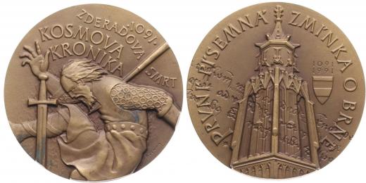 Brno - první písemná zmínka o Brně 1091 - 1991 Kosmova kronika - Zderadova smrt / věž, opis, Sign., Bronz 70 mm KZ.55