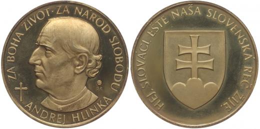 A.Hlinka - poprsí zleva, opis / státní znak, opis, b.l. Sign.DZ, Pozlac. Ag 900, 40 mm, 37,6 g, náklad 200 ks, čís.22