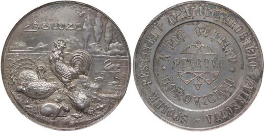 Spolek pěstitelů králíků, drobného zvířestva a pro ochranu ptactva v Hořovicích - Zásluze, b.l., domácí zvířectvo, nápis / nápis, dvojitý opis, Sign.Šmakal Praha, Postř.bronz 45 mm, 22 g