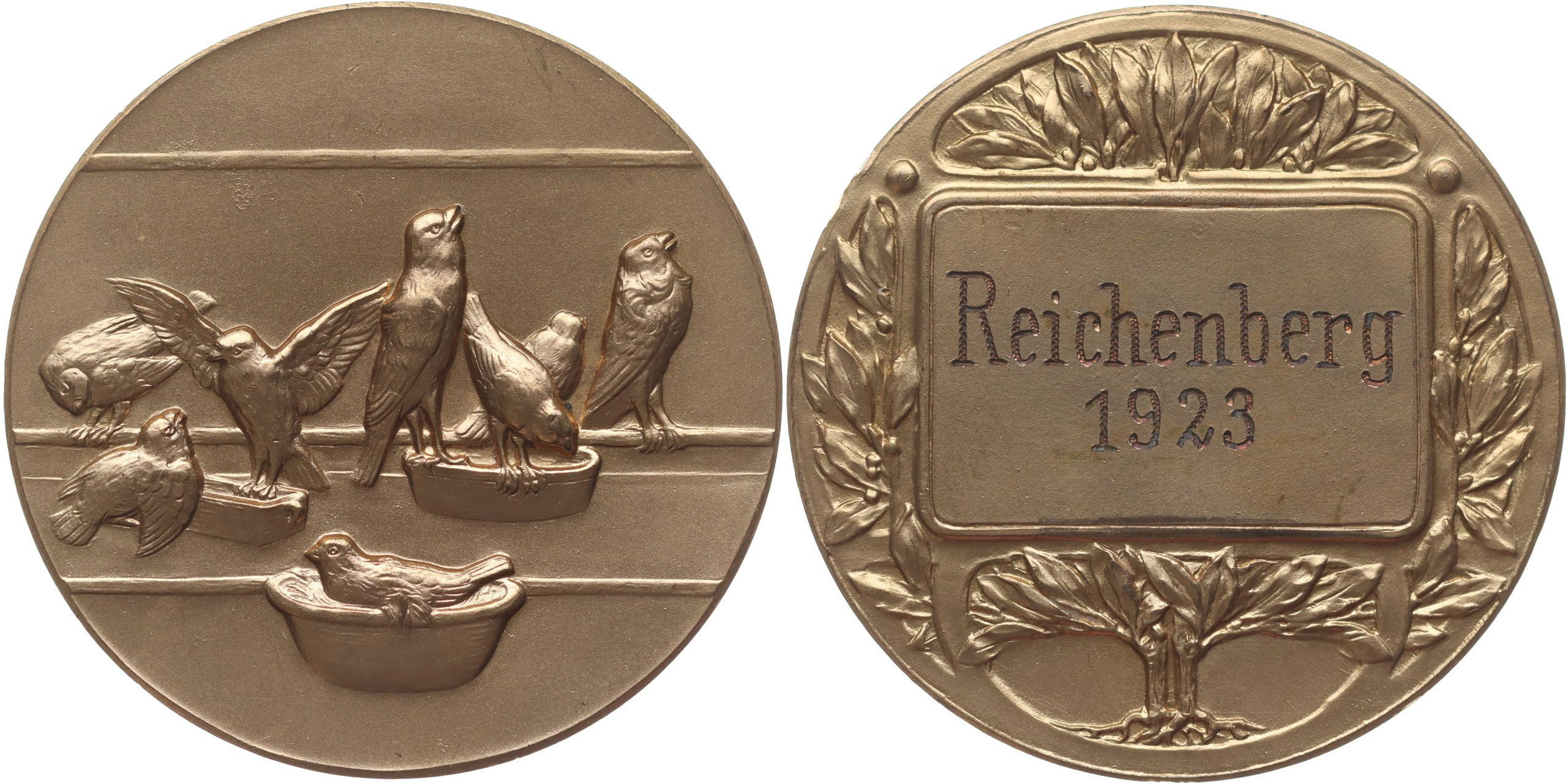 Nesign. - hejno holubů / ve štítku 2řádk.nápis REICHENBERG 1923 Pozlac.bronz 40 mm, 22 g