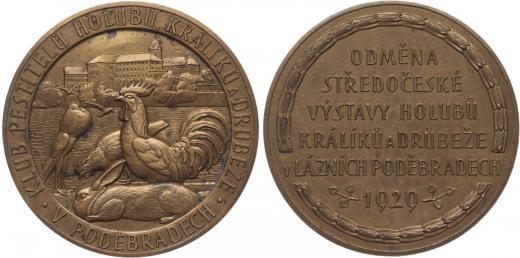 Nesign. - klub pěstitelů holubů, králíků a drubeže - odměna středočeské výstavy holubů, králíků a drůbeže 1929 Doimácí zvířata, v pozadí dominanty města, opis / 6řádk.nápis ve věnci, Bronz 40 mm, 20 g
