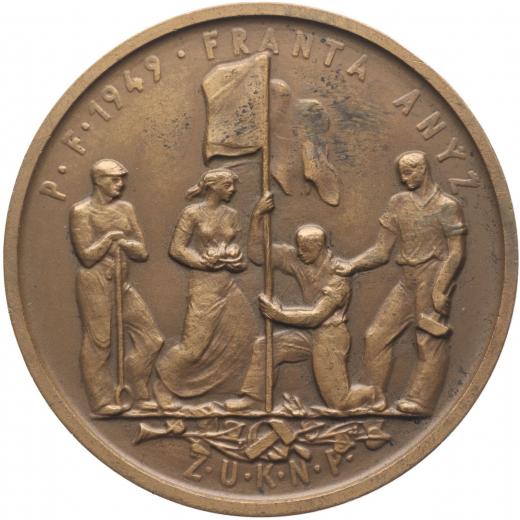 Sign.KA - PF 1949 - Franta Anýž - Z.U.K.N.P., čtyři postavy vztyčují vlajku, lipová ratolest překrytá srpem a kladivem, opis Bronz patinov. 50 mm_jednostranná R!
