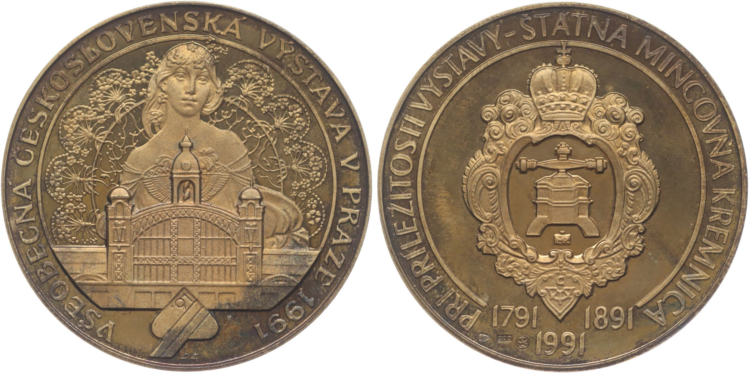 D.Zobek, M.Rónai - secesní ženská silueta, výstavní palác, opis / mincovní lis v korunované kartuši, opis 1791 - 1991, Sign., Punc.900, Pozlac.Ag 40 mm, 38,90 g, čísl.na hr.175