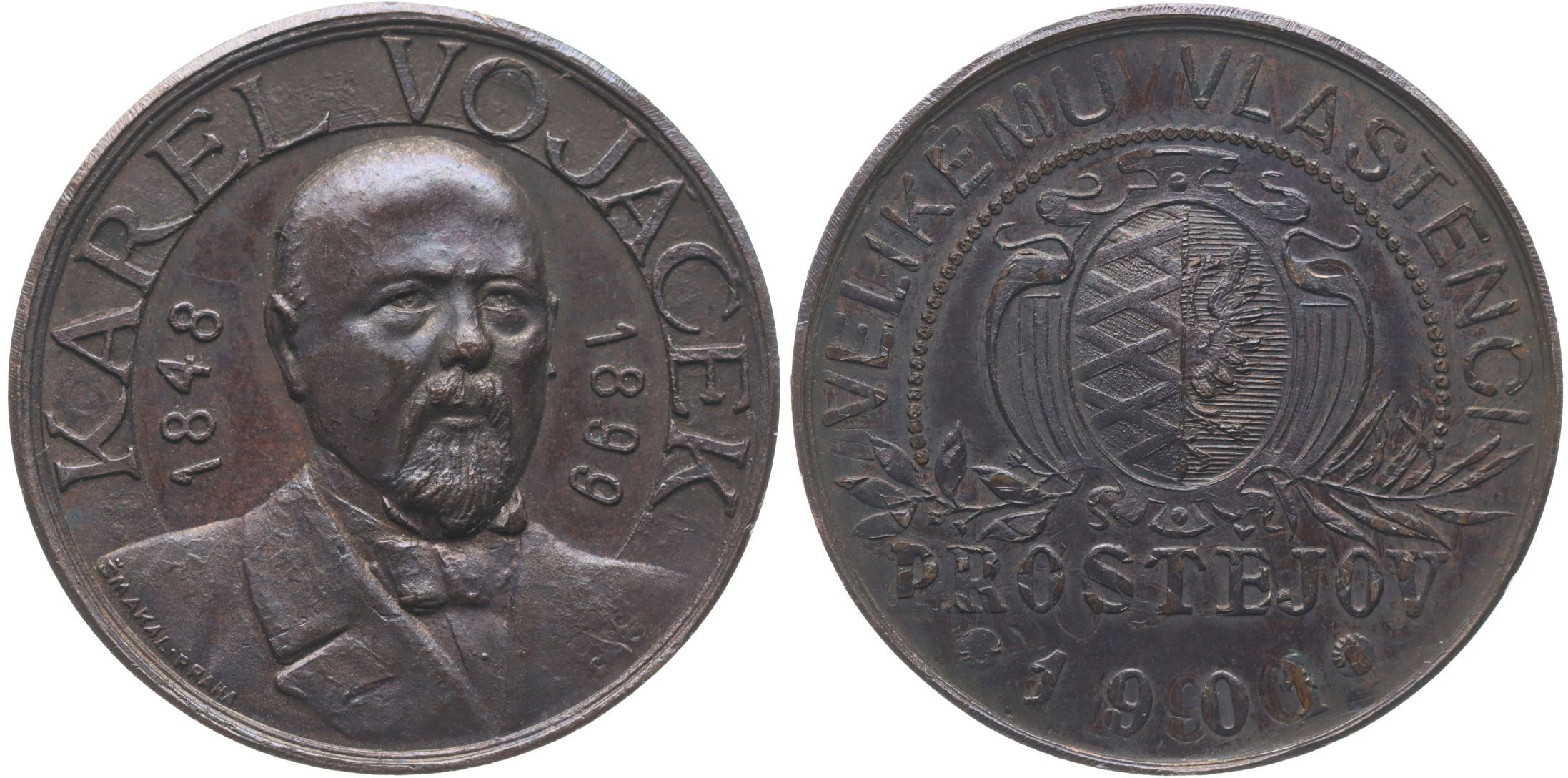 Šmakal - Karel Vojáček - velkému vlastenci Prostějov 1901#Cu Portrét čelně, opis / znak města, nápis, opis, Cu 34 mm