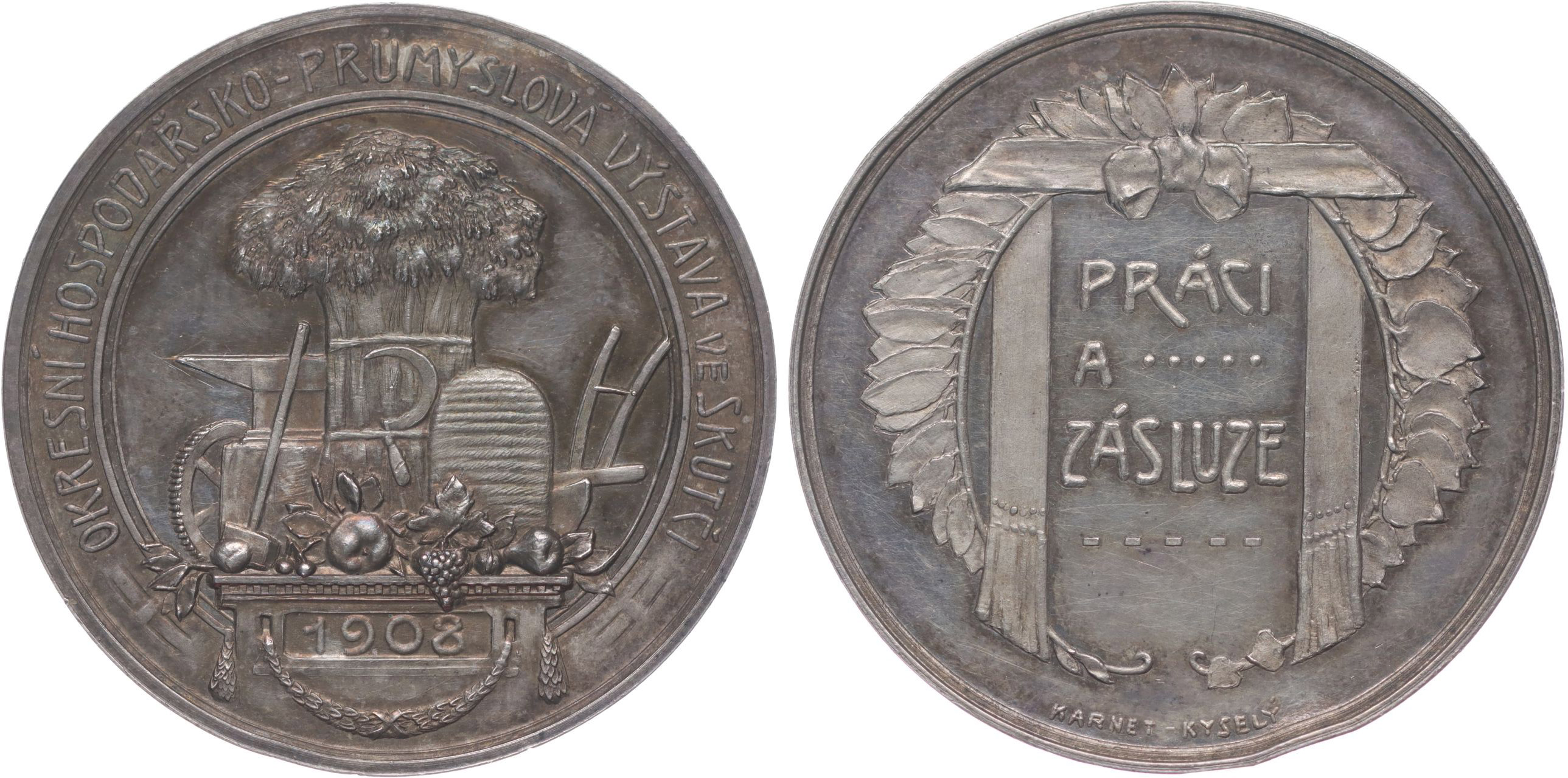Karnet-Kyselý - okresní hospodářasko-průmyslová výstava 1908 Práci a zásluze ve věnci / zemědělské atributy, opis Sign., Punc. na hr., Ag 40 mm, 17,64 g_dr.hr.