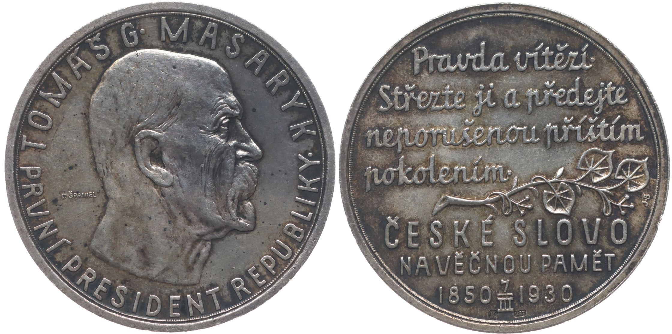 O.Španiel - České Slovo k 80.narozeninám, 7.III.1930 Hlava zprava, opis / 7-řádkový nápis a lipová ratolest Sign., Punc., Ag 35 mm, 14.98 g, Fl.31, Nov.01.071