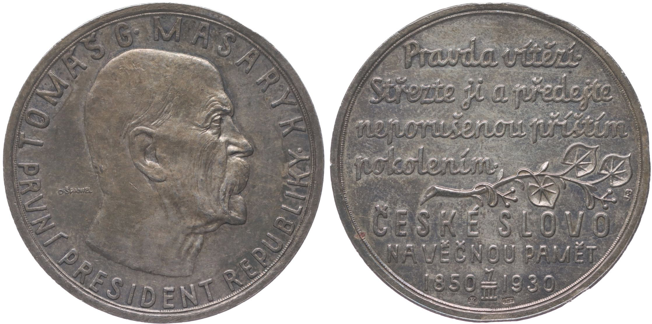 O.Španiel - České Slovo k 80.narozeninám, 7.III.1930 Hlava zprava, opis / 7-řádkový nápis a lipová ratolest Sign., Punc., Ag 35 mm, 15,00 g, Fl.31, Nov.01.071_dr.hr. orig.etue