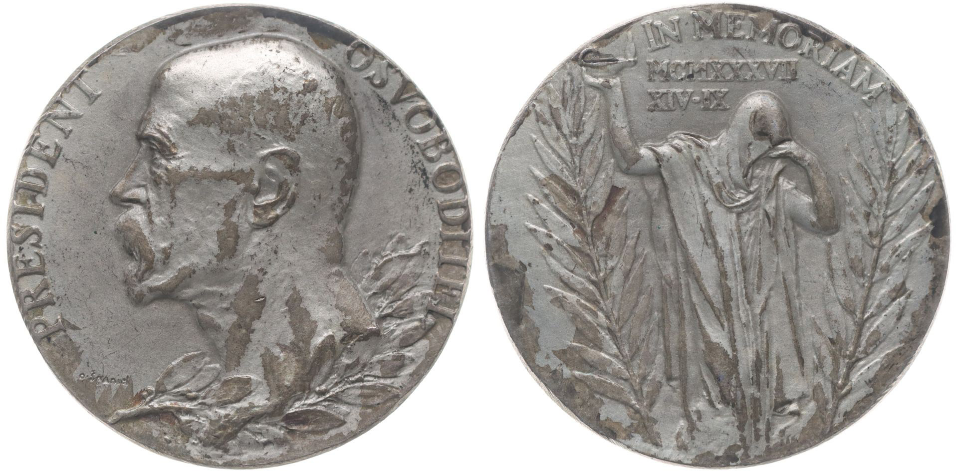 O.Španiel - úmrtní medaile, 1937 (Ag matové 30 mm) Poprsí zleva, vavřín.ratolest, opis / truchlící postava, palmy, nápis, Sign., Ag 987, 14.6 g, Fl.54e, Nov.01.138a