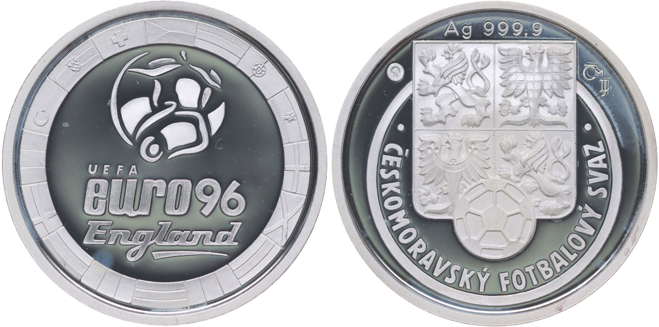 Českomoravský fotbalový svaz - mistrovství Evropy Anglie 1996 Punc.999.9, Ag 34 mm, 16.11 g_orig.kapsle