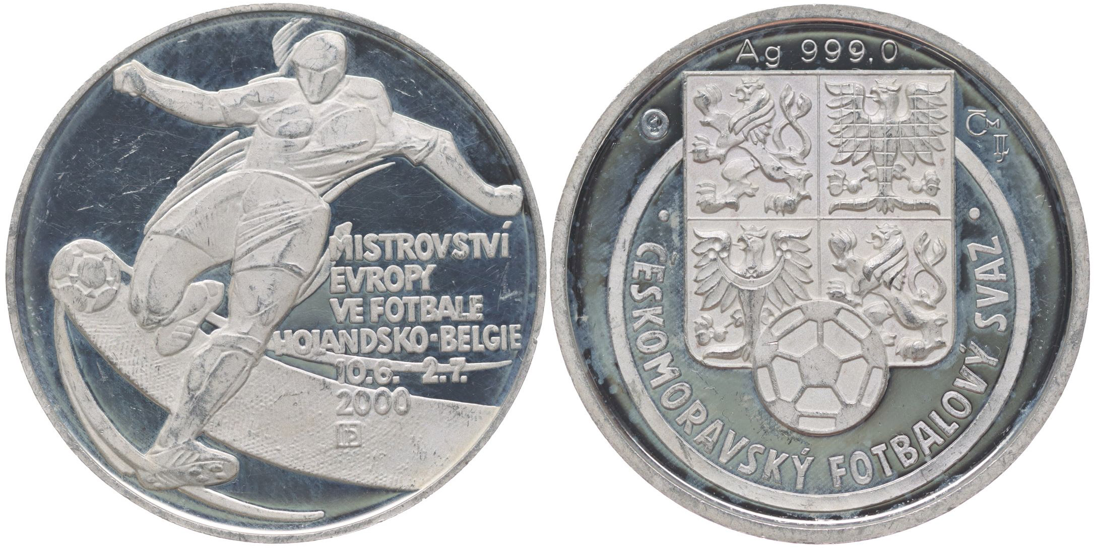 Českomoravský fotbalový svaz - mistrovství Evropy Holandsko - Belgie 2000, Punc.999.9, Ag 40 mm, 20 g_orig.kapsle
