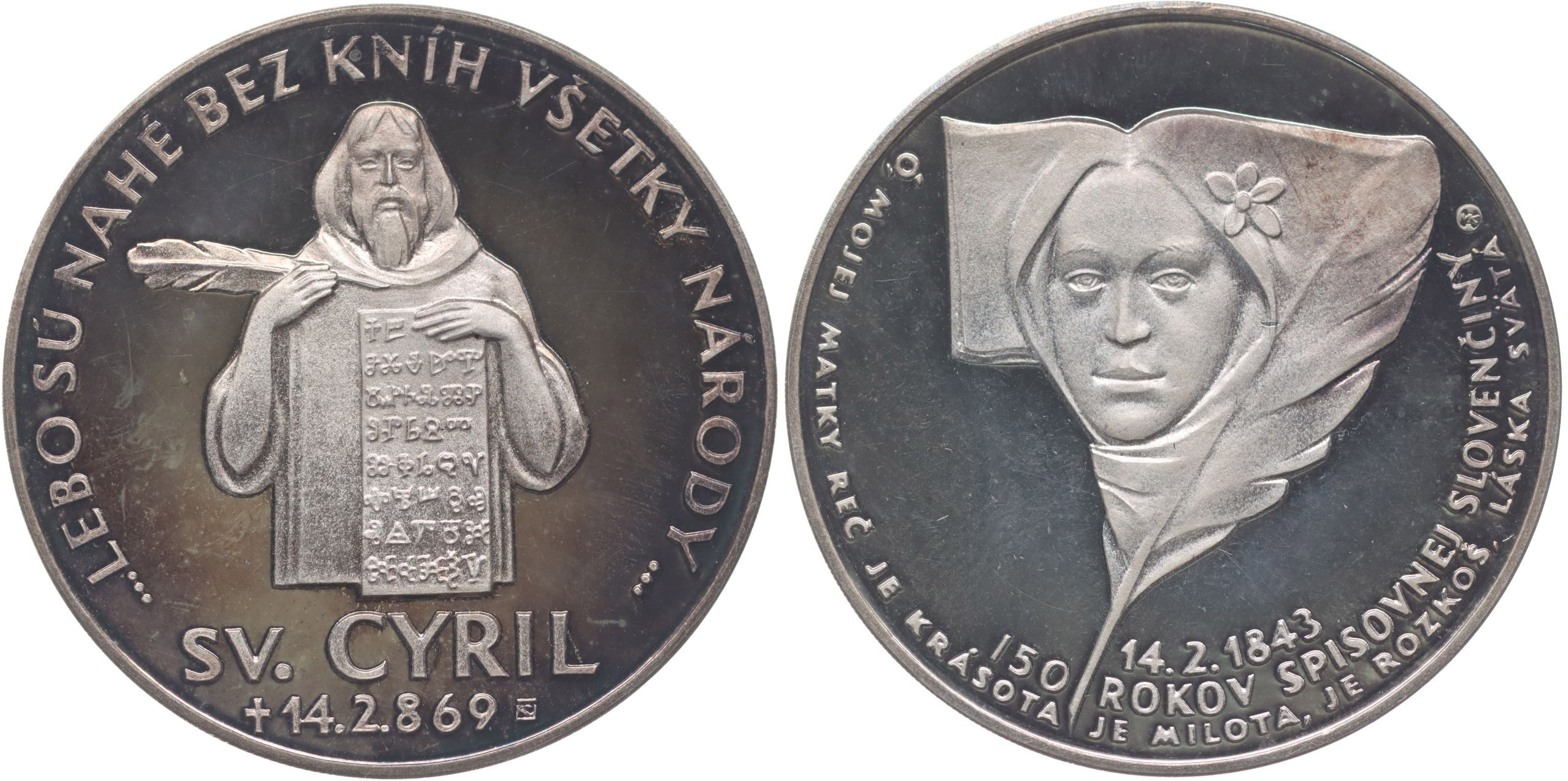 Nesign. - 150 let spisovnej slovenčiny, 1843 - 1993 Hlava ženy na knize, trojitý opis / polopostava sv.Cyrila, nápis, opis Punc.900, Ag 40 mm, 38,70 g