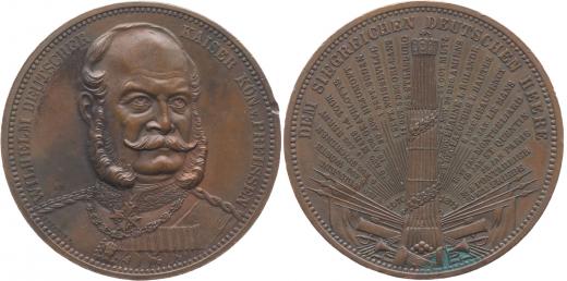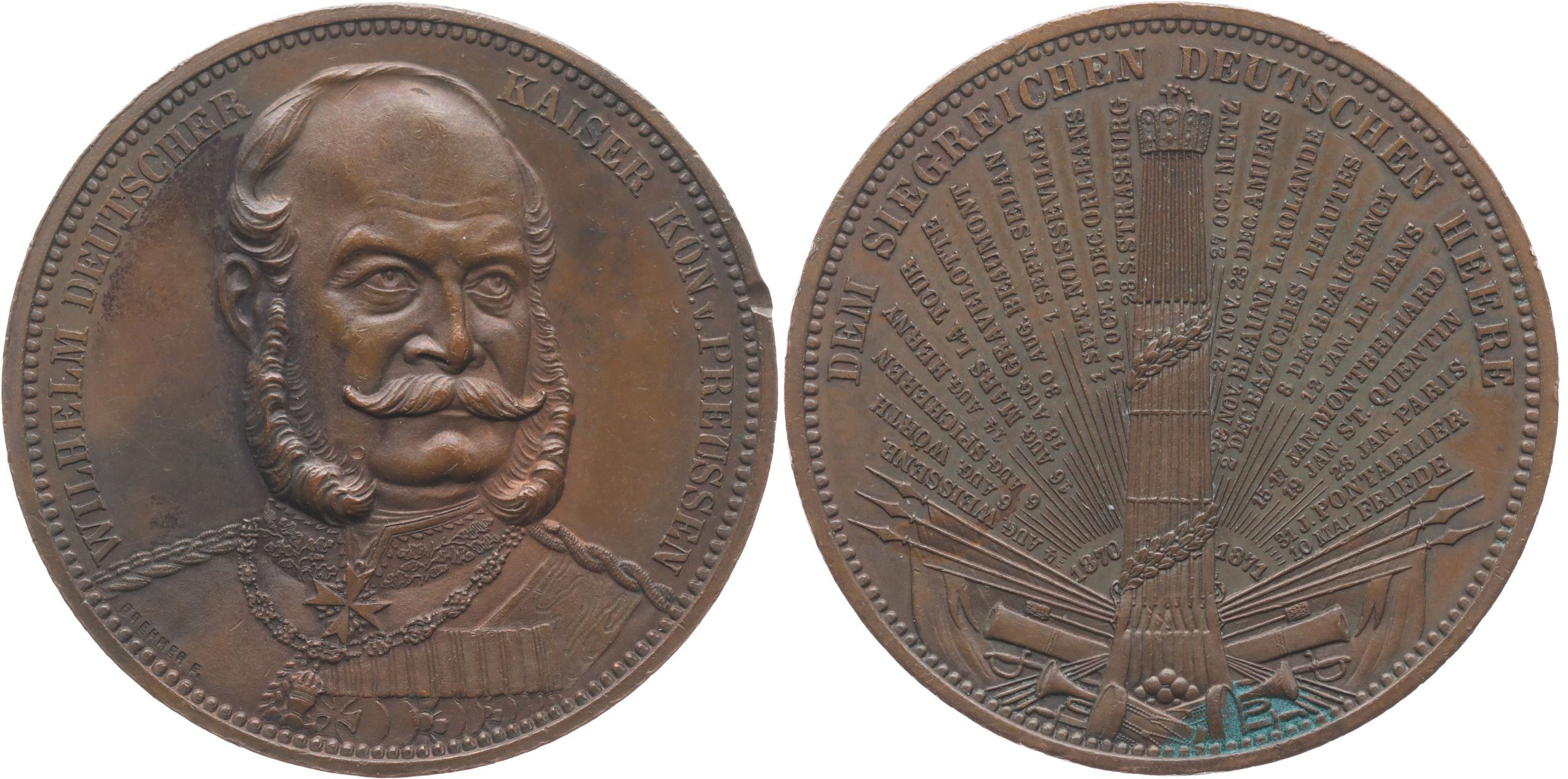Vilém I. - na vítězství Německa nad Francií 1870 -1871 Poprsí čelně, opis / u sloupu vojenské atributy, v ploše data vítězných bitev, opis, Sign.Brehmer F., Bronz 40 mm_dr.hr.