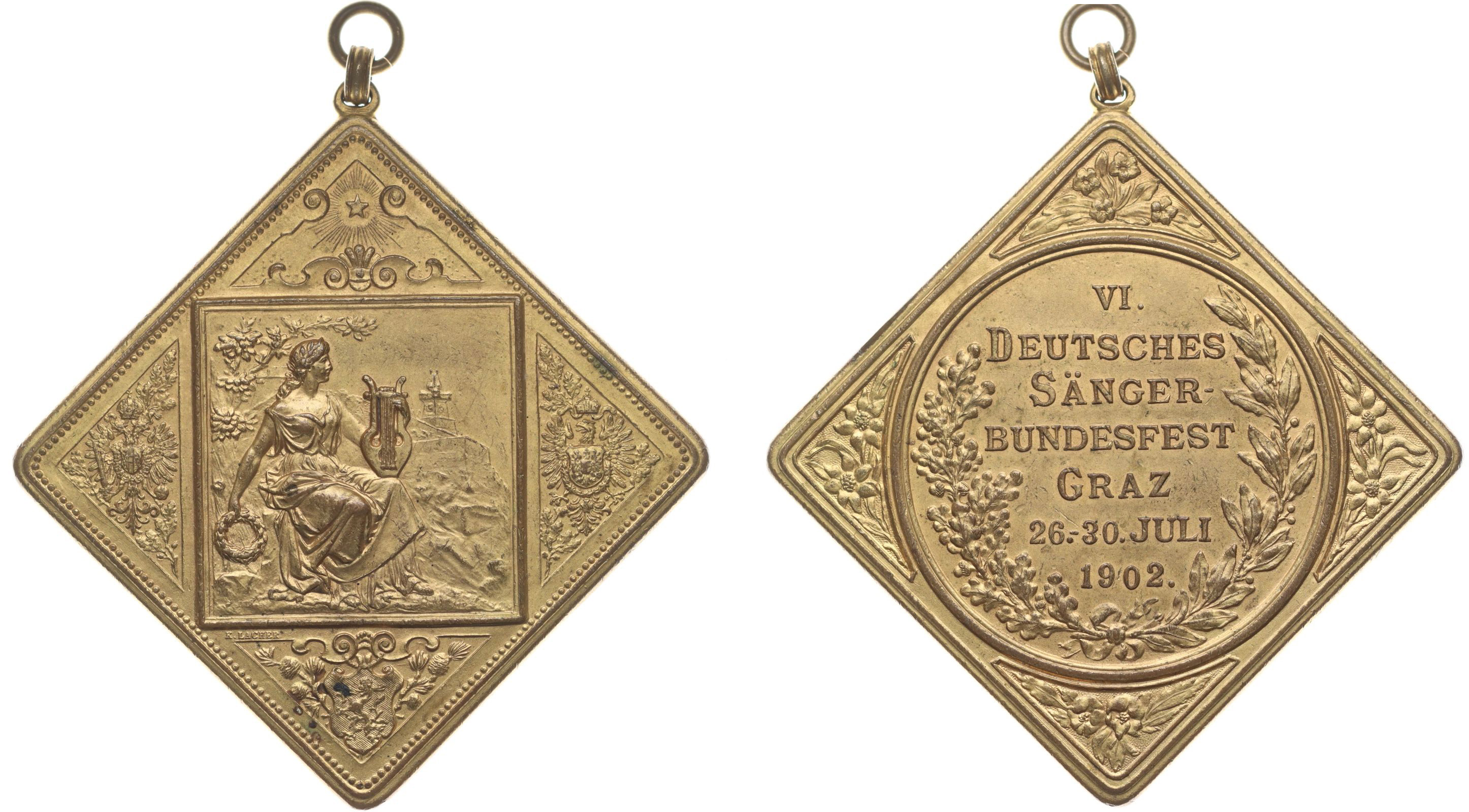 Graz - v upomínku na 6.německé setkání pěveckých spolků 1902#Pozl Žena s lyrou v rámečku, kolem znaky Rakouska a Štýrska / 7řádk. nápis ve věnci v kruhu, Sign.K.Lacher, Pozlac.bronz.klipa 65x65 mm _orig.raž.ouško se závěsem