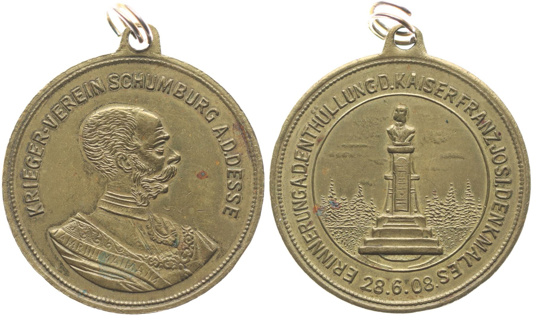 Šumburk nad Desnou (Schumburg a.d.Desse) - medaile na odhalení pomníku Frant.Josefa I. 28.6.1908, poprsí císaře, opis / pomník, opis Mosaz 28 mm_orig.raž.ouško se závěsem