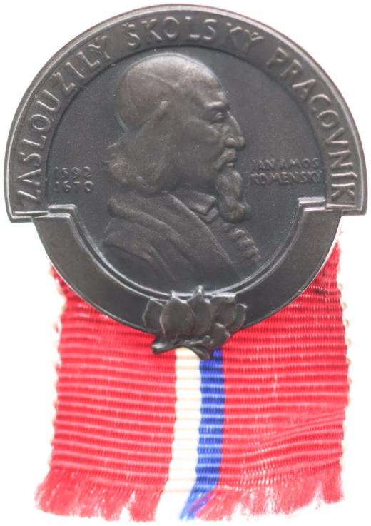 Zasloužilý školský pracovník - připínací stříbrný odznak, Punc 900, Ag, Pulec.C25c_se stužkou