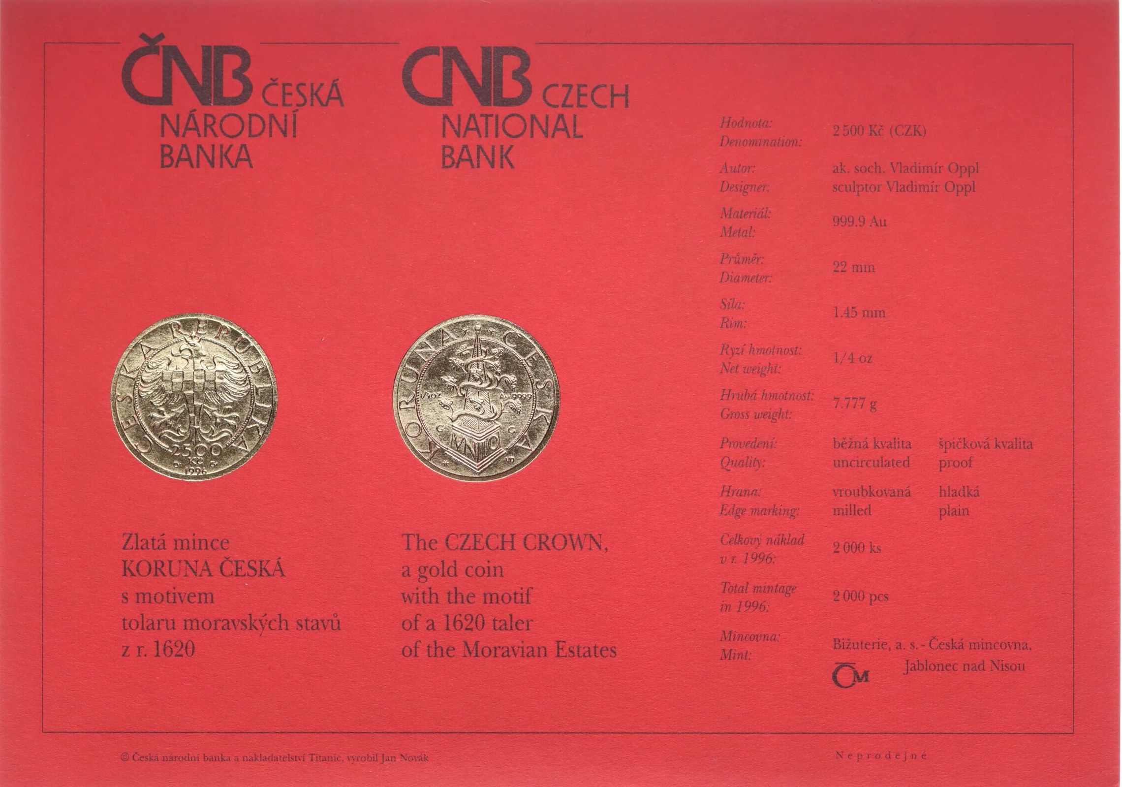 Karta (certifikát) pro minci 2500 Kč 1996 - tolar Moravských stavů