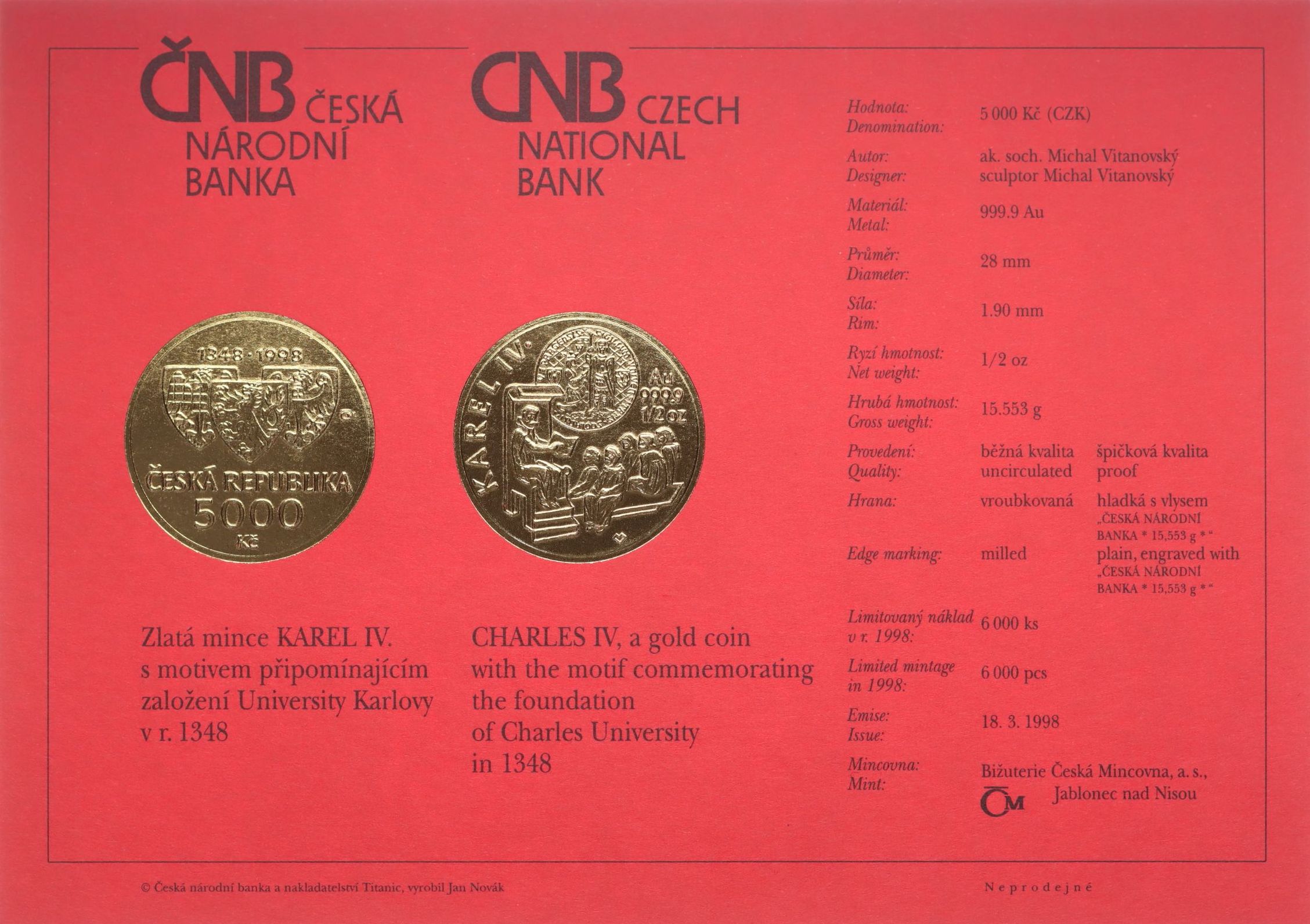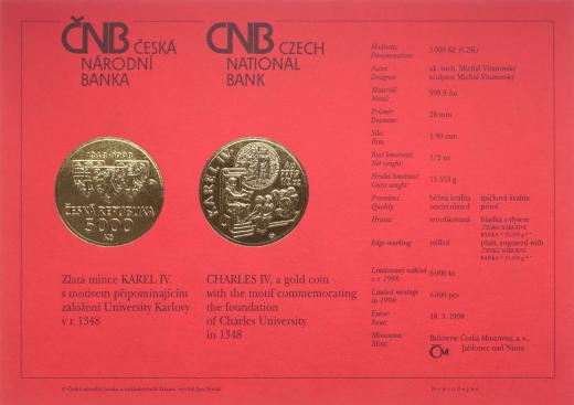 Karta (certifikát) pro minci 5000 Kč 1998 - Karel IV.