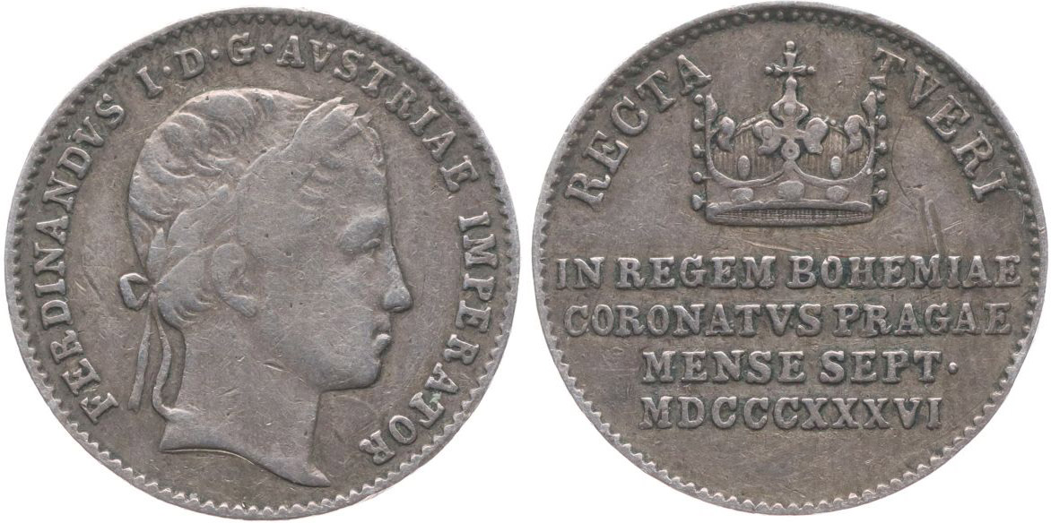Menší peníz na korunovaci v Praze, 7.IX.1836 Portrét, opis / koruna, nápis, opis, Nesign. Ag 18 mm, 3.29 g, ČS.1494, P.3/24, M.2565, Nov.XVIII/D-4b
