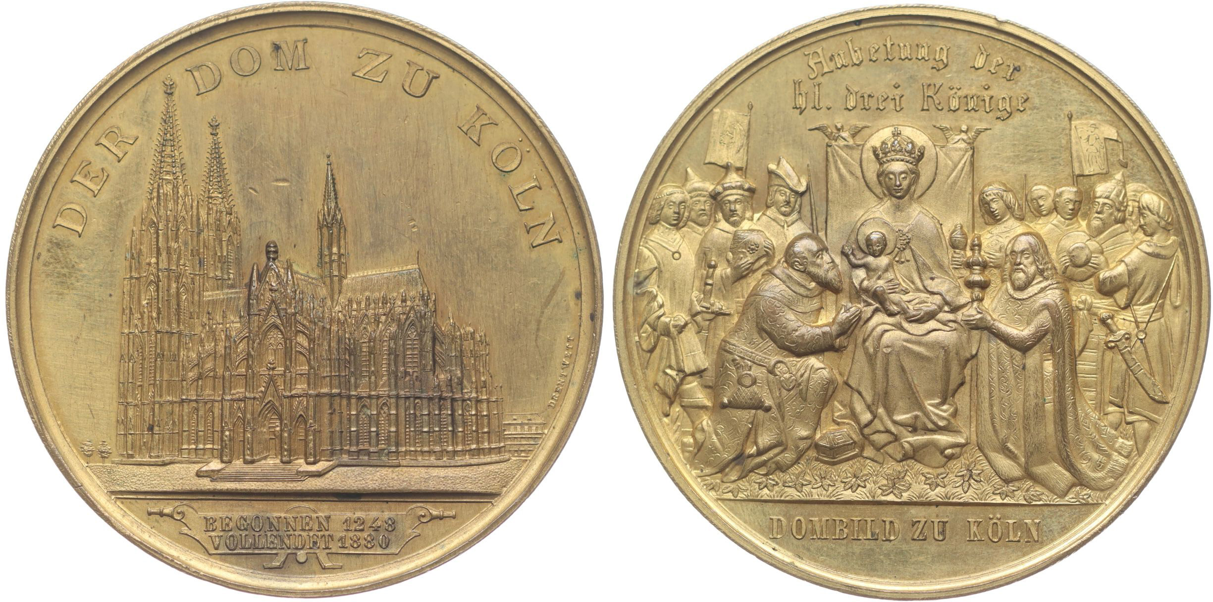 Drentwett - na zvelebení dómu v r.1880 Pohled na dóm, 2řádk.nápis, opis / scéna klanění tří králů, nápis v úseči, opis, Pozlac.bronz 50 mm