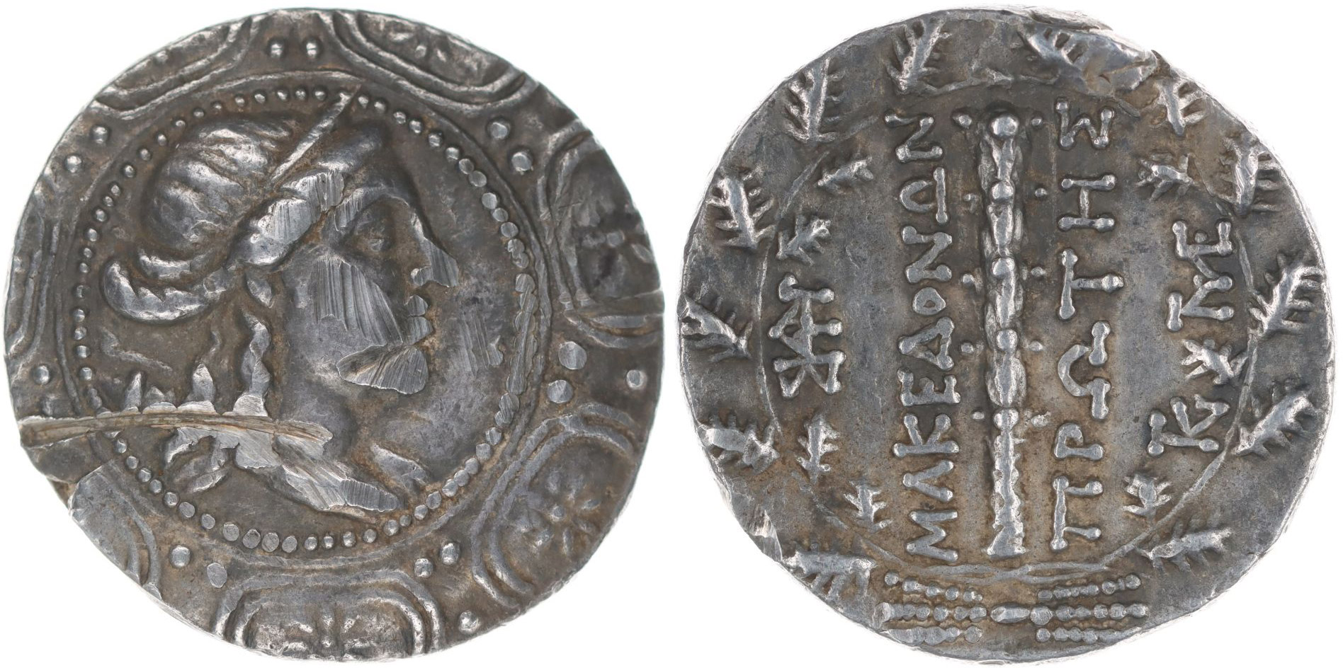 AR Tetradrachma, Hlava Artemis zprava na makedonském štítu / kyj a nápis v obilném věnci, monogram a stylizovaný blesk, podobný jako SG.1386, SNG.1310-11, BMC.816, 16.92 g_dr.sek v av. R!