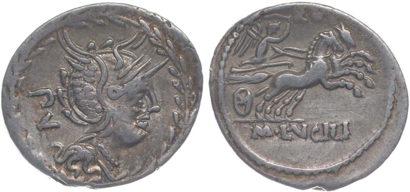 AR denár, Hlava Romy doprava, monogram"PV" / Victoria v bize zprava, nápis "M.LVCILI.", Crawford.324/1, Al.1129, Ves.1124